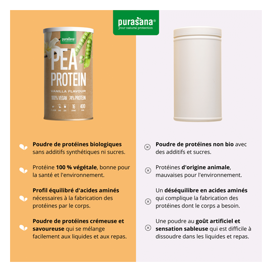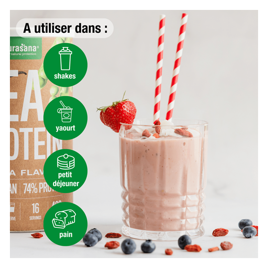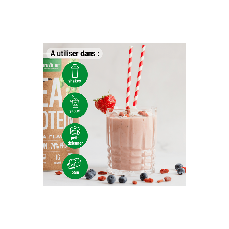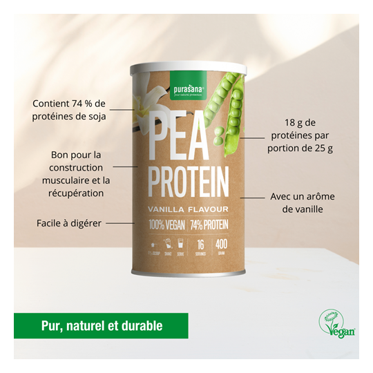 - 74 % de protéines provenant de la poudre de protéines de pois