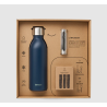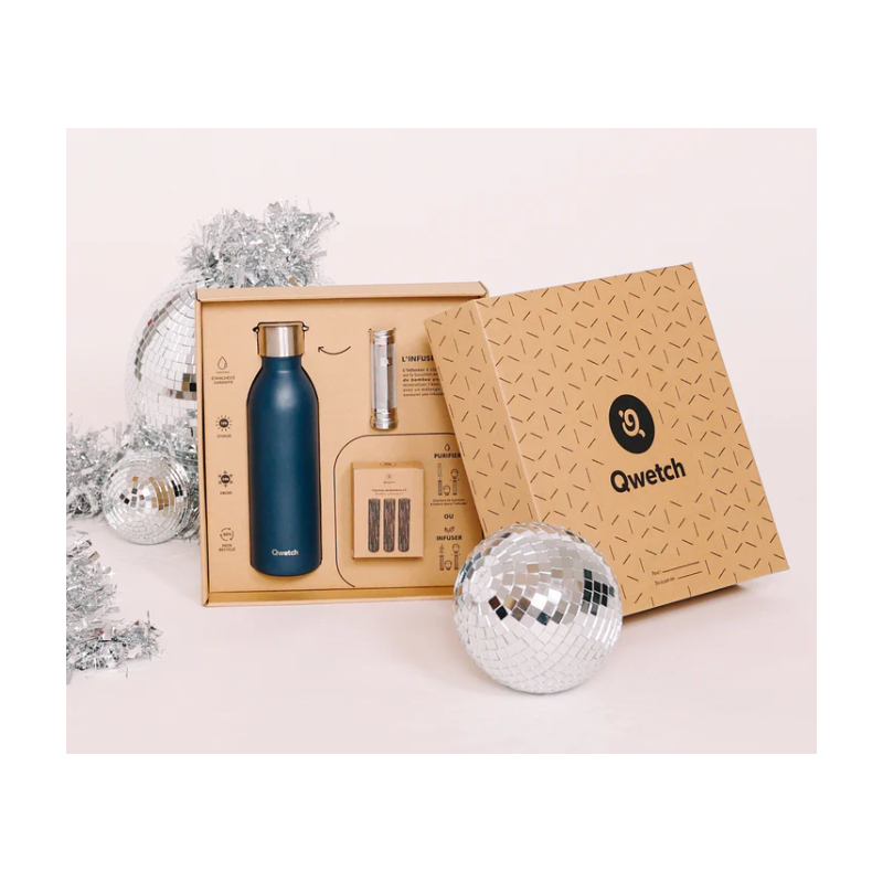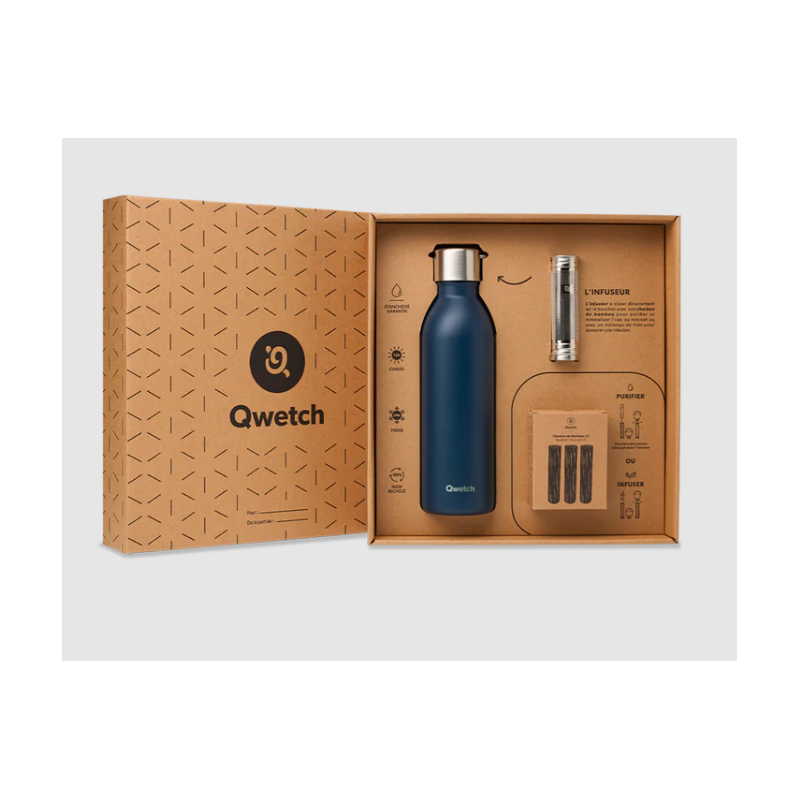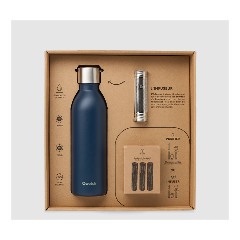 Ce coffret contient une bouteille isotherme 600ml Active Marine, un infuseur en inox et trois charbons de bambou.