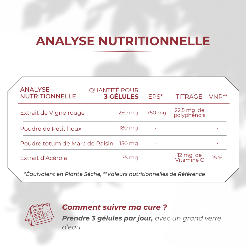 La feuille de vigne rouge est utilisée à des fins médicinales depuis des millénaires, remontant même au temps d'Hippocrate. Les vignerons français ont également exploité ses bienfaits en fabriquant des pâtes à partir de ses feuilles pour soulager les jambes enflées et douloureuses pendant des siècles. Cette plante est riche en polyphénols, des antioxydants naturels présents dans le raisin et d'autres plantes. Avec plus de 100 composés différents, tels que les flavonoïdes, les anthocyanes, les procyanidines et les acides phénol-carboniques, les feuilles de vigne rouge sont connues pour leurs effets positifs sur la circulation sanguine et la santé vasculaire.
