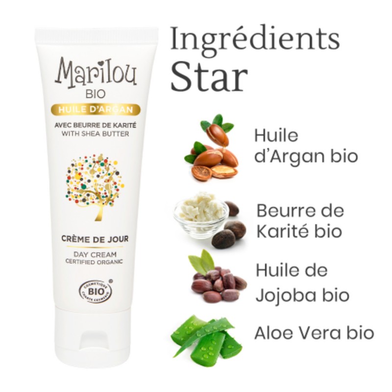 La Crème de Jour hydratante et nourrissante à l'Huile d'Argan bio Marilou Bio prend soin de votre peau au quotidien pour lui apporter douceur, confort et souplesse tout en la protégeant des agressions extérieures.