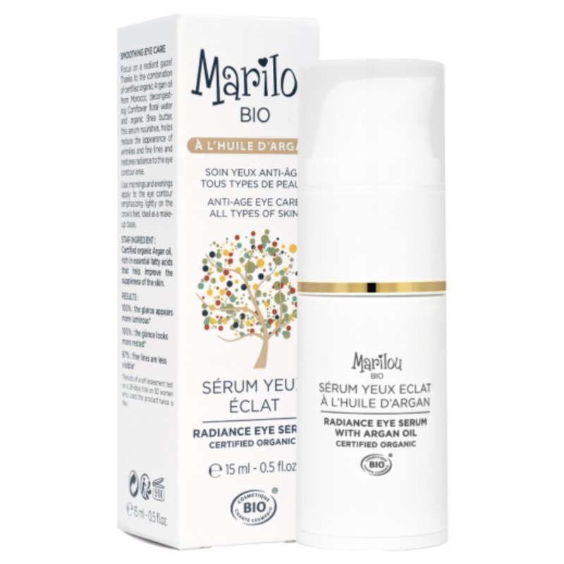Le Sérum Yeux Éclat à l'Huile d'Argan Marilou Bio à la texture fluide nourrit et aide à réduire l’apparence des rides et des ridules tout en redonnant de l’éclat au contour de l’oeil. Sa formule associe l’Huile d’Argan bio du Maroc à l'Eau florale de Bleuet et au Beurre de Karité. Sa texture légère pénètre rapidement, laissant la peau douce, lumineuse et parfaitement apaisée.